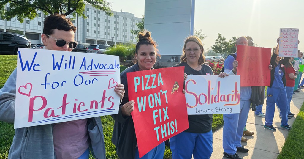 At St. Joseph, we got the union in March, and we’ve had a bargaining session with other Ascension nurses in Wichita and Austin, and we’re all asking for the same thing. We’ve asked them to let us bargain at the same time, but Ascension has refused. We could see the writing on the wall with what was happening with the other hospitals. They like to pretend the union doesn’t exist here. We knew that the best thing for us to do was to have all three hospitals strike at the same time. Ascension management was telling staff that it would take a year to bargain the contract. And rumblings through management and talking to staff, they are now saying that it might take two years to get a contract. We want the same things that the other nurses want and we had power together.